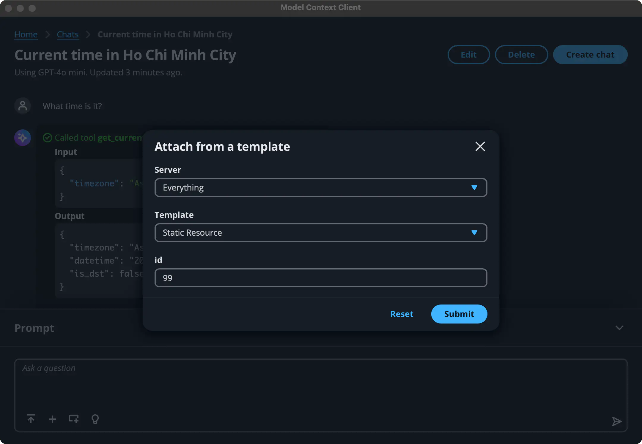Add resource templates to automate workflows. Supports arguments, user/assistant messages, and image/file attachments.