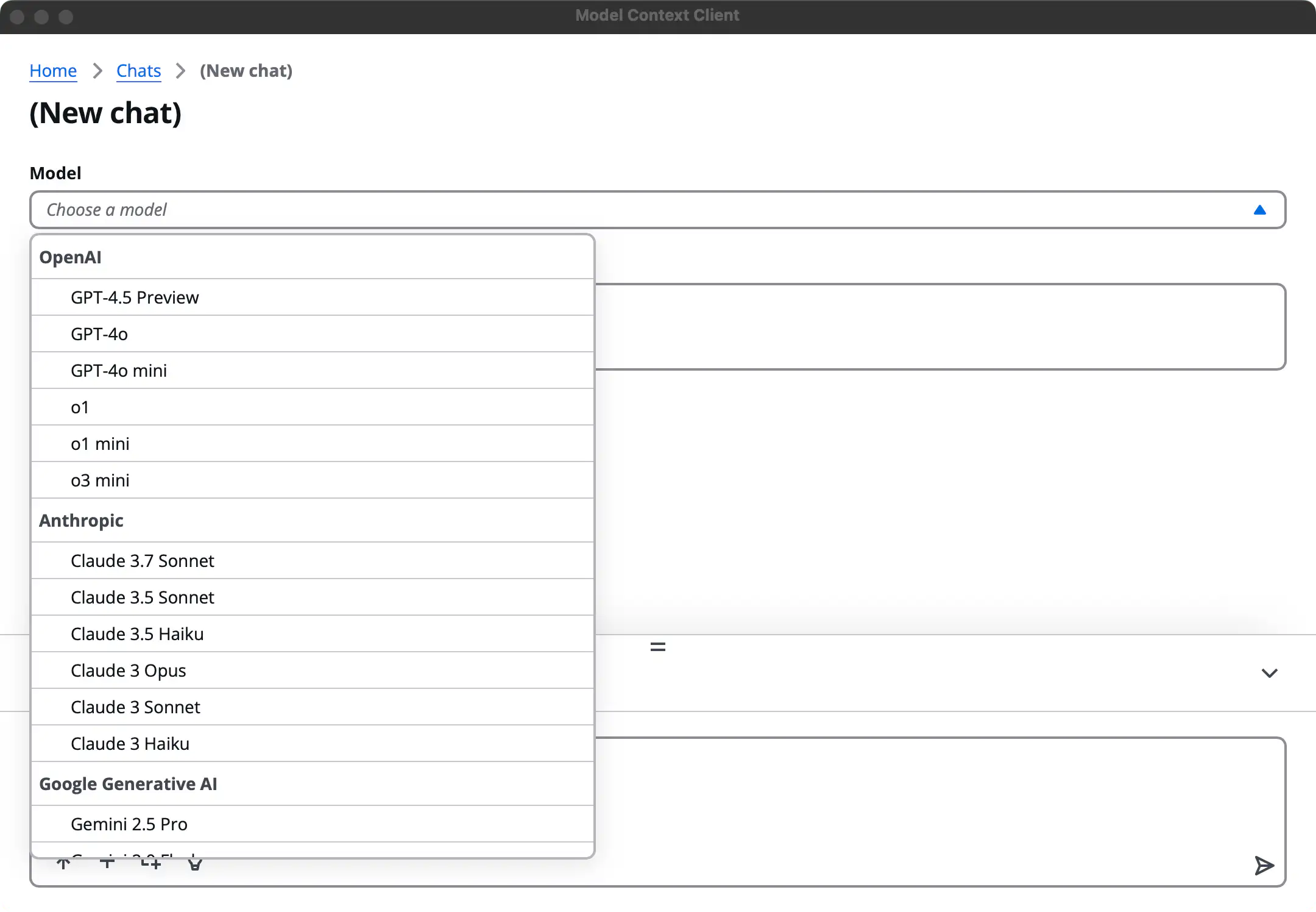 Connect seamlessly with MCP servers and chat with many AI models through a familiar browser-like interface.